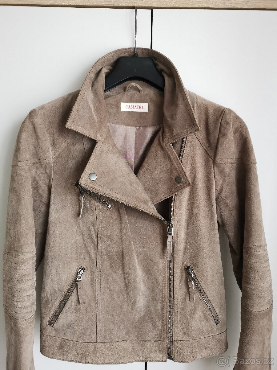 Prodám krásnou koženou bundu od zn. CAMAIEU. Téměř nová, velmi málo nošená. Velikost 38. Materiál je pravá hovězí kůže (broušená), podšívka je polyester. Zapínání na zip, dvě přední kapsy a náprsní kapsička též na zip.