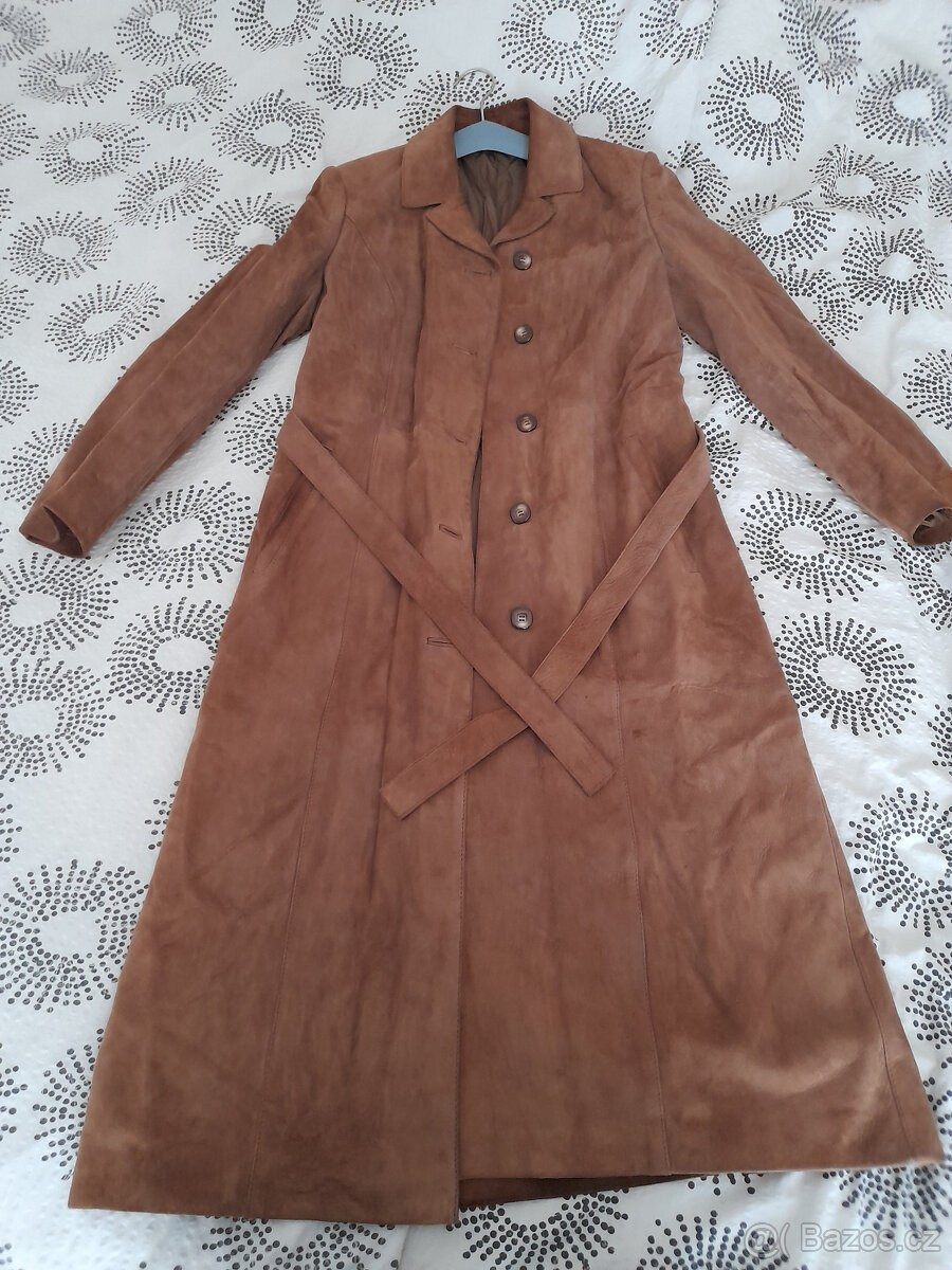 Prodám dámský hnědý semišový kabát, vel. 42, dlouhý s páskem. Nošený, v zachovalém a nepoškozeném stavu - viz fotografie. Zdědila jsem, ale bohužel to není moje velikost. Někomu jinému určitě ještě dobře poslouží.