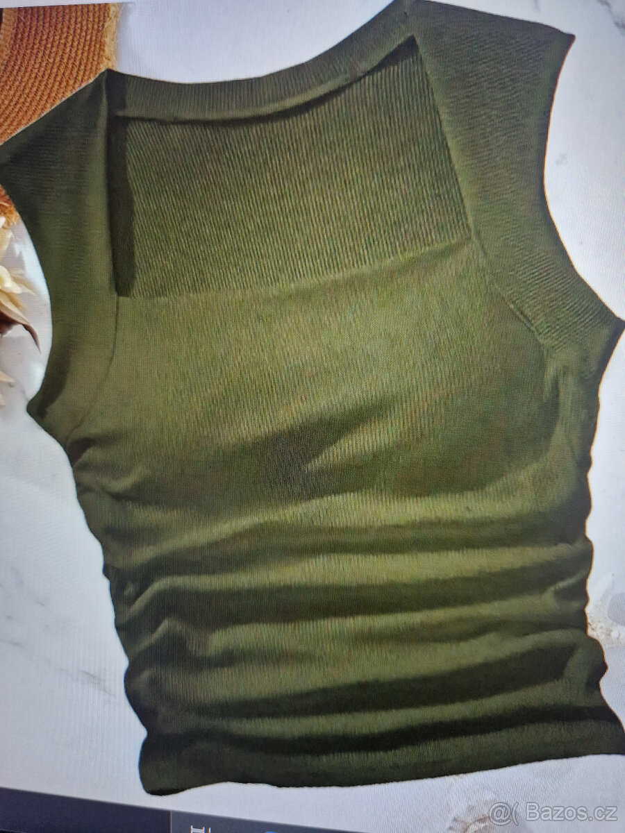 Prodám nový topík zajímavého střihu,čtvercový výstřih,khaki barva,materiál polyeter.Poštovné 30,-Kč