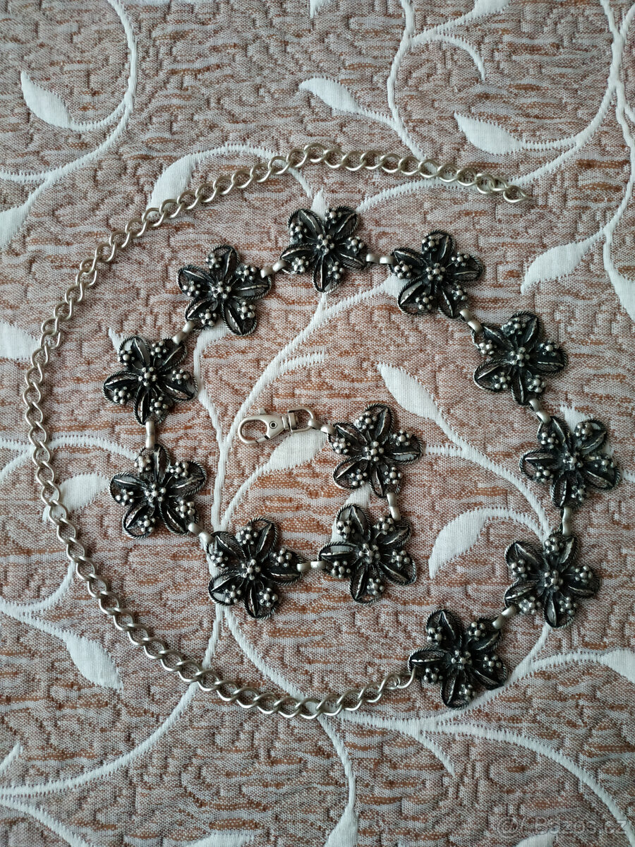 Výrazný řetízkový kovový opasek s květy. Hodí se jak ke každodennímu nošení, tak pro zvláštní příležitosti, jako doplněk ke svetru či šatům, k dobovým oděvům nebo na orientální tance.