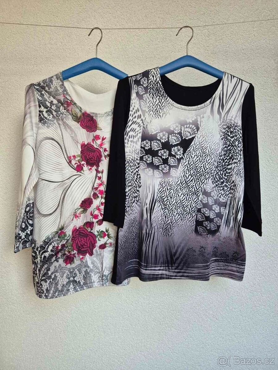 Prodám set dvou dámských triček s potiskem. Velikost cca 42. Délka trička 64 cm, prsa 47 cm, délka rukávu u bílé 49 cm a u černé 45 cm.