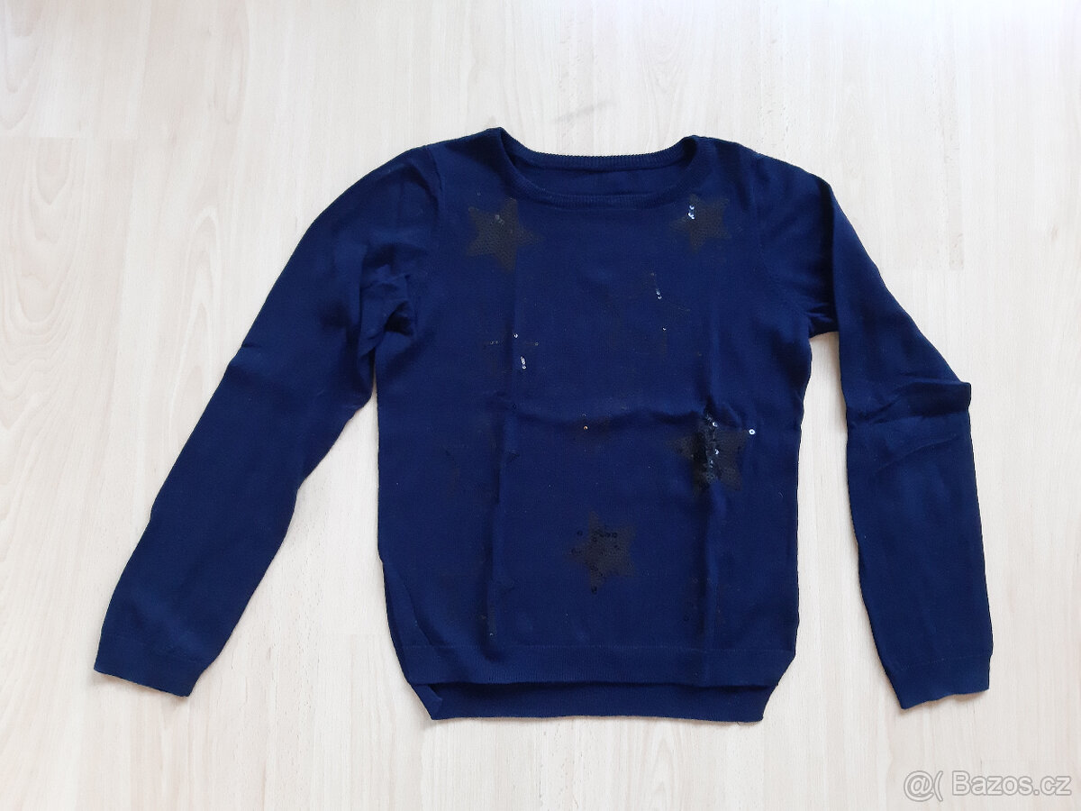 Prodám dívčí svetřík vel. 146/152, HaM, tmavě modrý, vpředu aplikace - hvězdy z tmavých flitrů, 100% bavlna, sváteční vzhled.