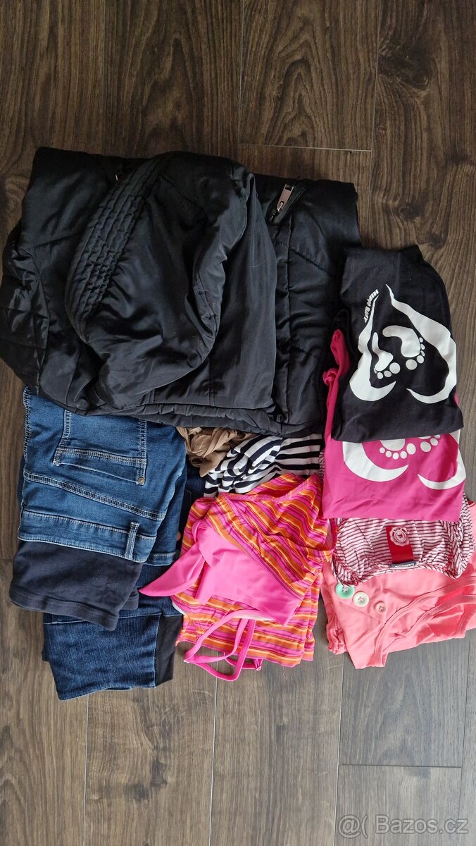 Kabát černý, plavky, riflová sukně, punčocháče, rifle (drobné napárnutí - nafoceno), šaty, 4 ks triček.