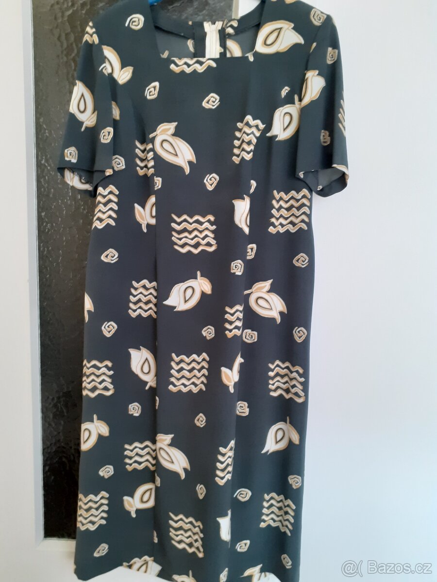 Prodám letní dámské šaty, šedé barvy se vzorem. Velikost XL, šířka ramen=43cm, délka šatů od ramen=116cm. Vzadu je zip až k pasu.