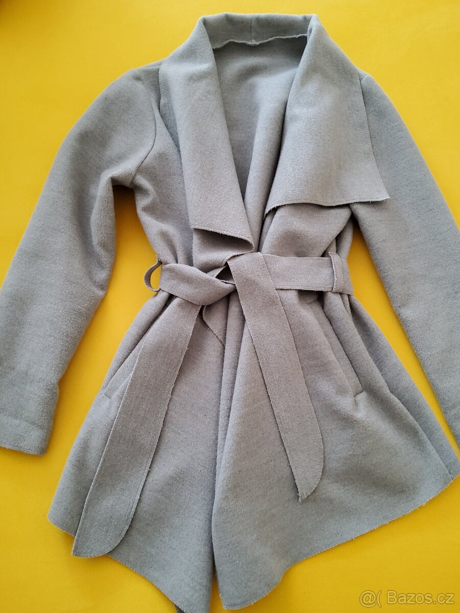 Jednovrstvý lehký jarní kabátek s větším límcem, páskem, poutky a kapsami v elegantní světle šedé barvě ve velikosti M-L. Je v dobrém stavu. Lze jej prát v pračce