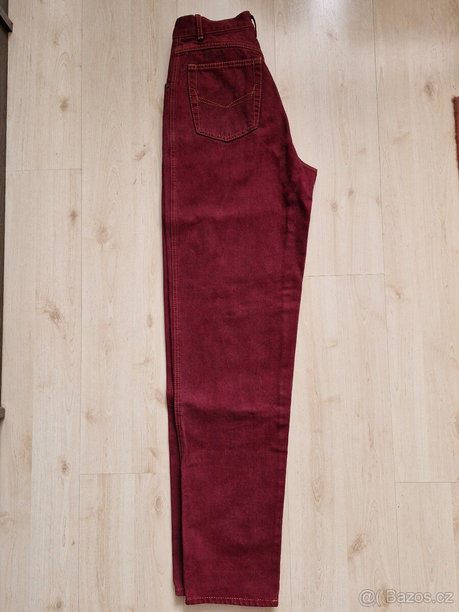 Dámské, dívčí rifle, vínové barvy, 1/2 šíře pasu 32 cm, boční délka 110 cm.