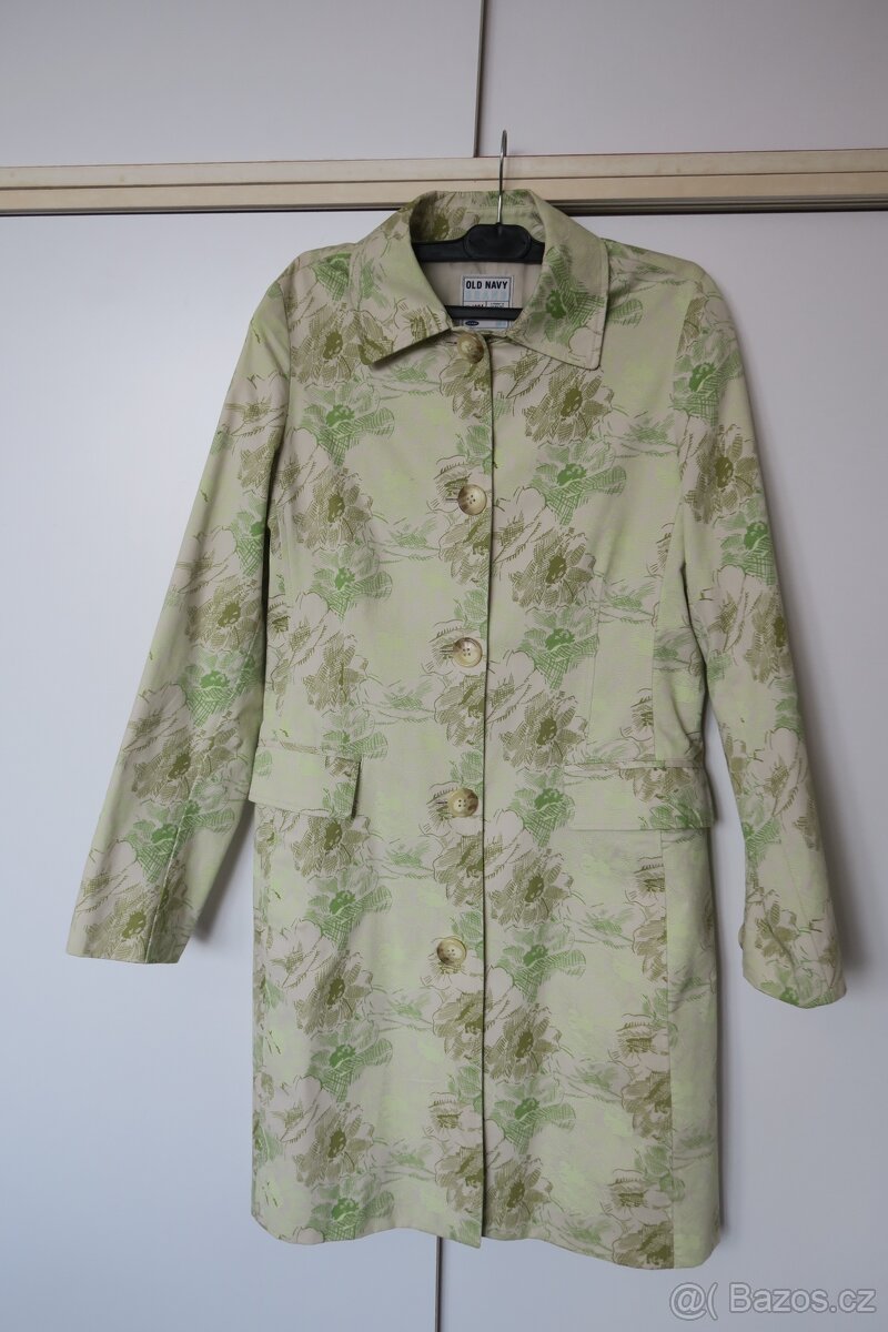 Světle béžový kabát s potiskem do zelena značky OLD NAVY. Kabát je ze 100% bavlny, velice příjemný na dotek, podšívka z polyesteru, vypasovaného střihu, dvě kapsy na předním díle. Velikost 38/M, délka 94 cm, šířka v pase 44 cm.