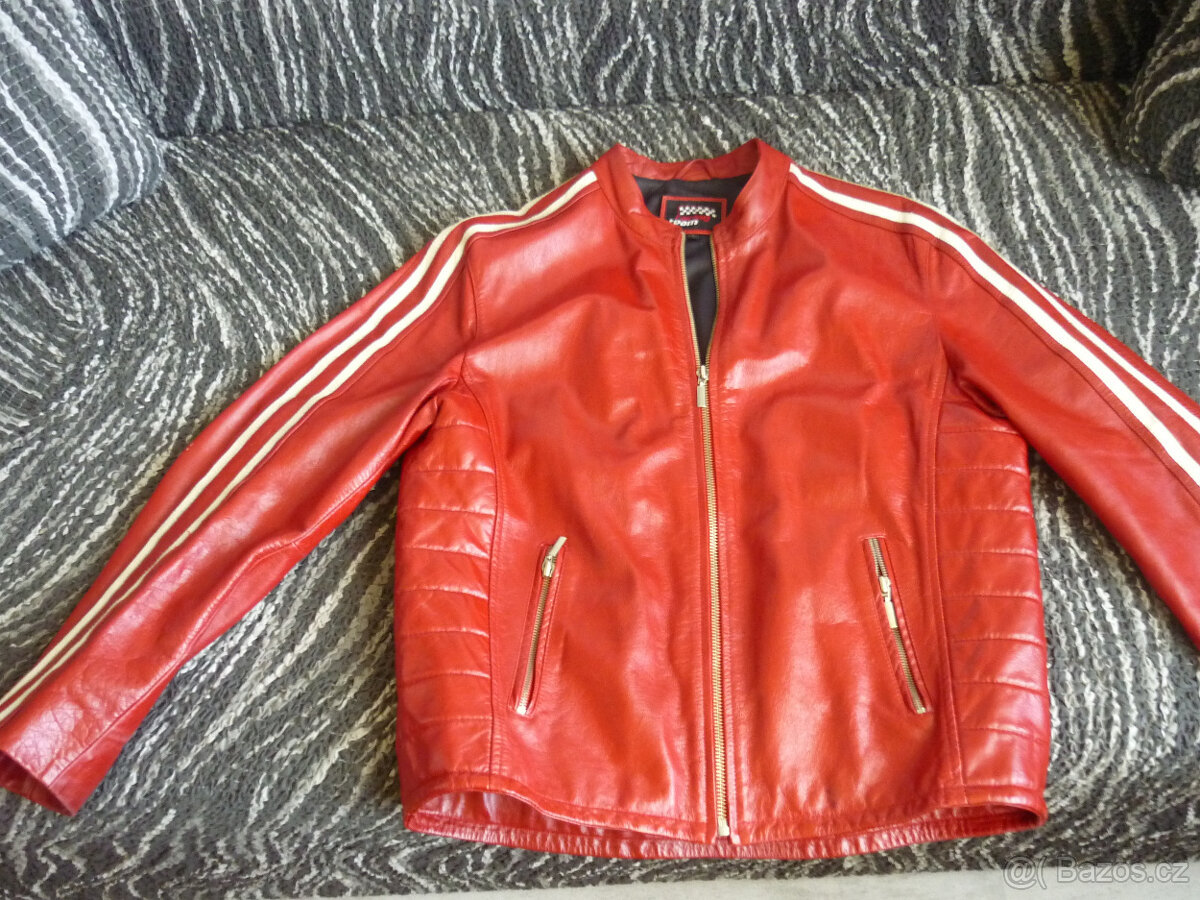 Prodám koženou bundu velikost L červená,bílé pruhy,pravá kůže