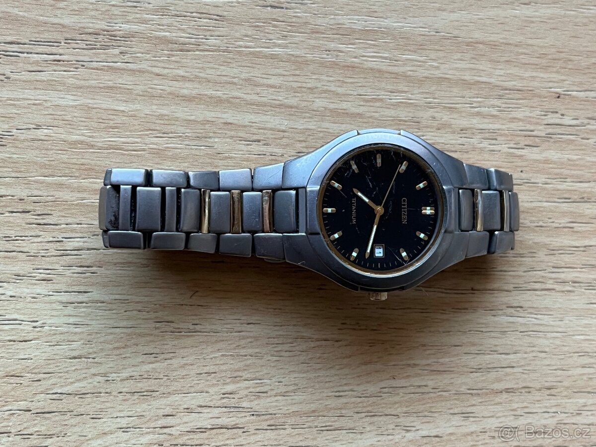 Titanové hodinky Citizen Quartz- funkční, průměr bez korunky 38mm, na obvod ruky max 19cm. Mají dost poškrábané sklíčko a na něm malou prasklinu- na výměnu nebo lze používat bez ní. Vložena nová baterie Varta. Lze poslat poštou nebo zásilkovnou.