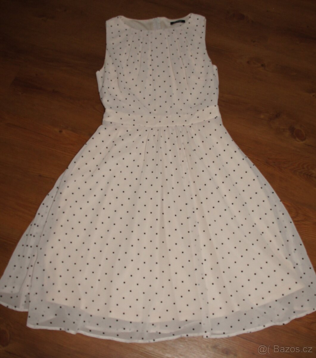Krásné puntíkaté šaty značky Orsay. Barva je béžová s černými puntíky. Velikost není uvedena, ale odhaduji, že se jedná o velikost XS/S čili 34/36. Koupené zde, mnou nenošené. Bohužel jsem netrefila velikost. Délka (měřeno od ramena) je 96 cm, šířka v místě pásku je 2x33 cm.