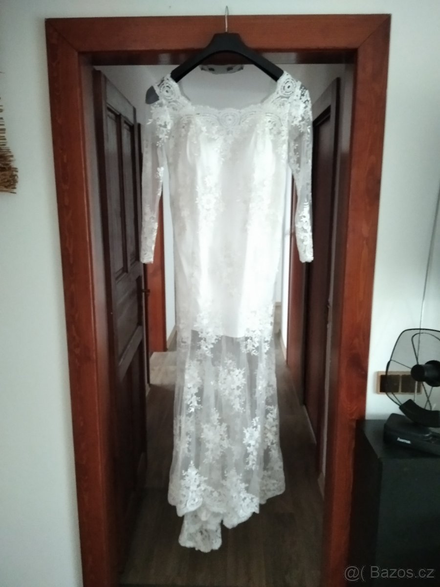 Prodám svatební šaty,šité na míru.Je to pro nevěstu menšího vzrůstu 158 cm.Vdávala jsem se v 8 měsíci těhotenství.Šaty jdou upravit u nějaké šikovné švadlenky jako jsme měla já.Původní cena byla 6.000.-Jsou celé z krajky,uvnitř jen spodnička.Možná dohoda