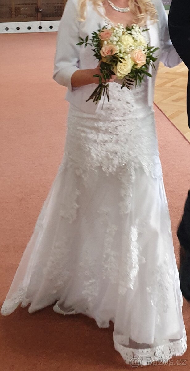 Nádherné svatební šaty mořská panna. - [29.4. 2026]V případě zájmu mi prosím napište přes formulář zde na Bazoši nebo pošlete SMS, děkuji.Velikost 36/38 , délka cca 150cm, oblast prsou je vyztužena, zapínání na zip. Jsou nádherné. Koukněte na mé další inzeráty, děkuji.