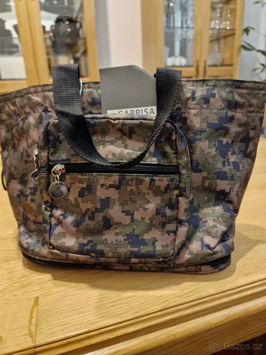 Zapínání je na zip, vevnitř jedna velká kapsa spolu s malou kapsičkou na zip + kapsičkou na telefon. Cvočky jsou v ...