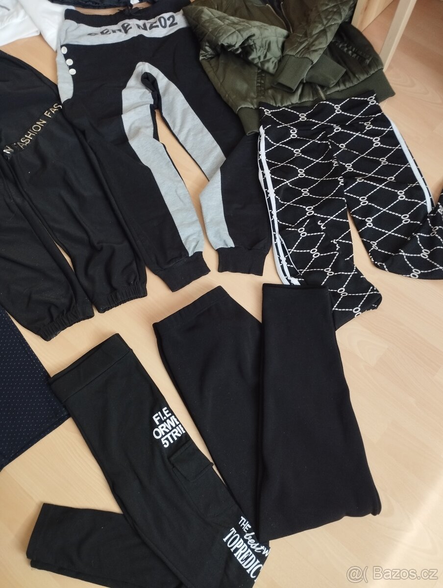 4x jarní,podzimní bunda,6 x tepláky,kalhoty, legíny.Celkem 10 ks které se k sobě dají perfektně kombinovat.Kus vychází na 100 Kč.