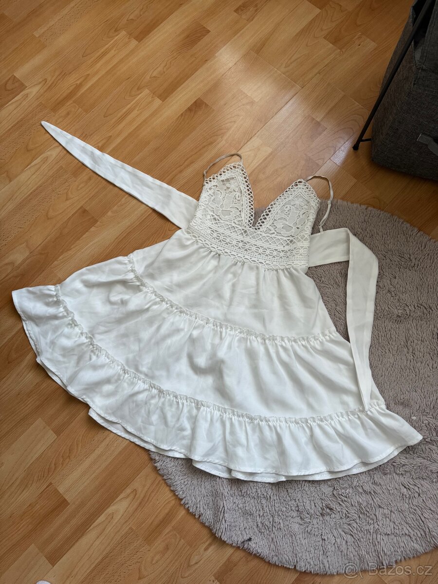 Lehký, vzdušný materiál – ideální na léto nebo dovolenou. Vrchní část zdobená krásnou krajkou, vzadu otevřený detail, velikost xs-s🤍