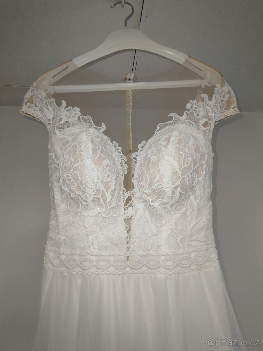 Nabízím k prodeji svatební šaty barvy ivory. Šaty jsou zkrácené na výšku 164cm a padnou na vel. 34-38 díky povolení v horní části šatů. Šaty jsou bez jakýchkoliv vad.