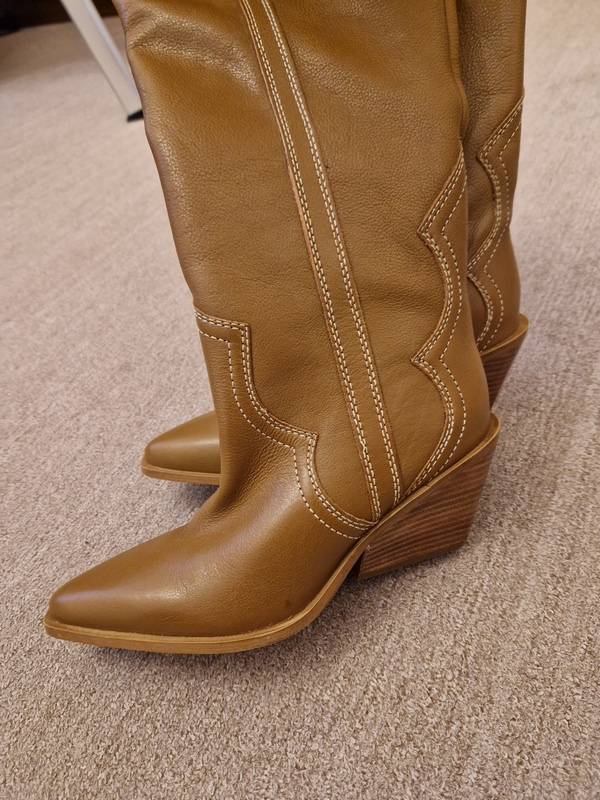 HNĚDÉ KOZENE WESTERNOVÉ KOZAČKY 38 - [18.4. 2026]Prodám vysoké westernové kozačky na štíhlou nohu 38. Výška ins podpatkem 39 cm, okolo nohy 34 cm. Cena 1500 Kč.