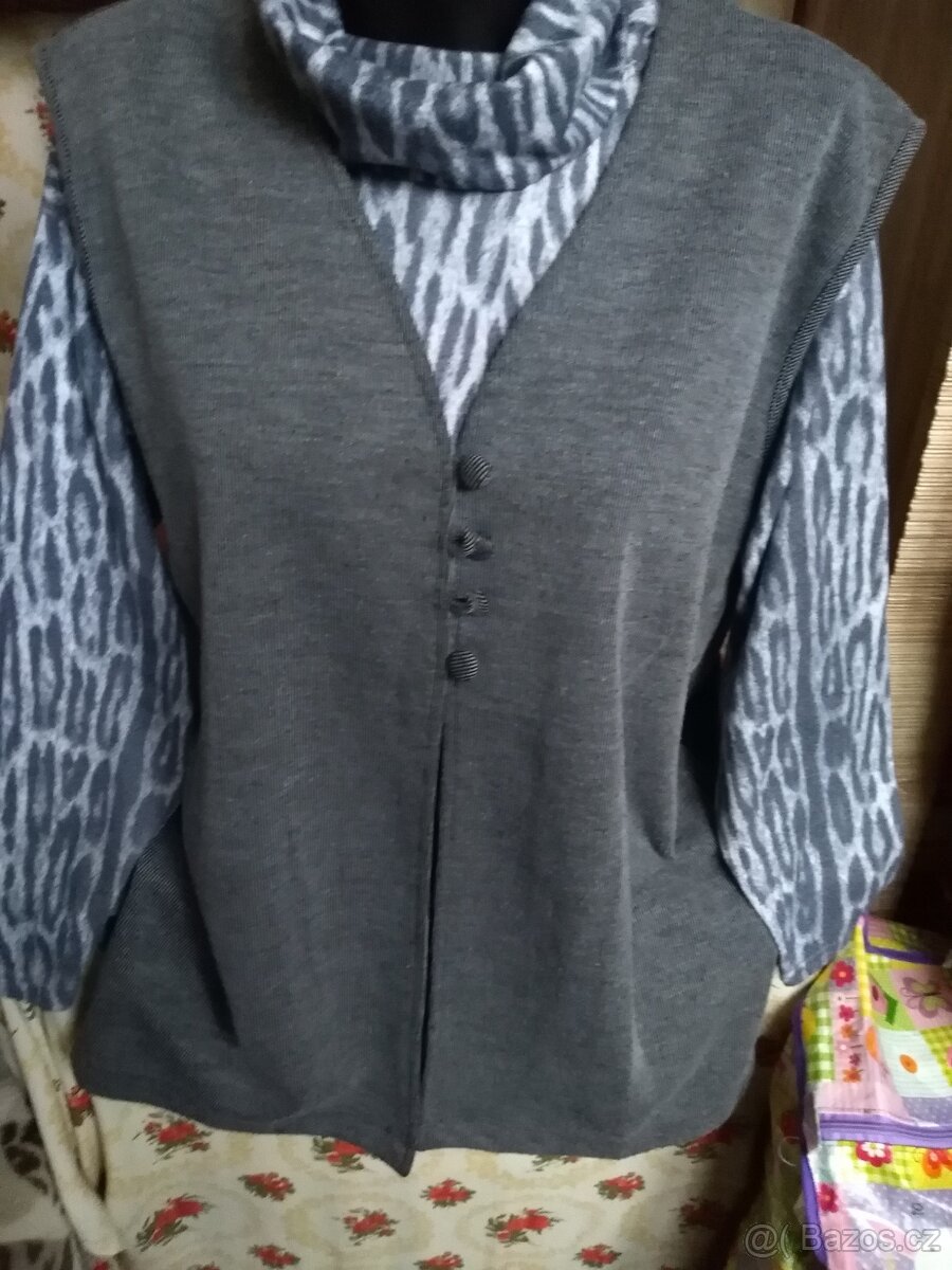 3-Třetí pružná vesta na knoflíky, zn. Faber, šedý melír, mater.polyamid+pes+elastan, nošená, běžné známky nošení, vel. se píše 42, míry zašlu-je zdarma ke těm dvěma vestám.