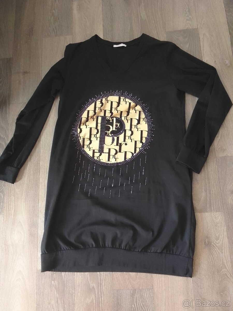 Černé šaty se zlatým potiskem. Jednou pouze použité, stav nových. Přes prsa 52 cm, záda 86 cm,velikost 46