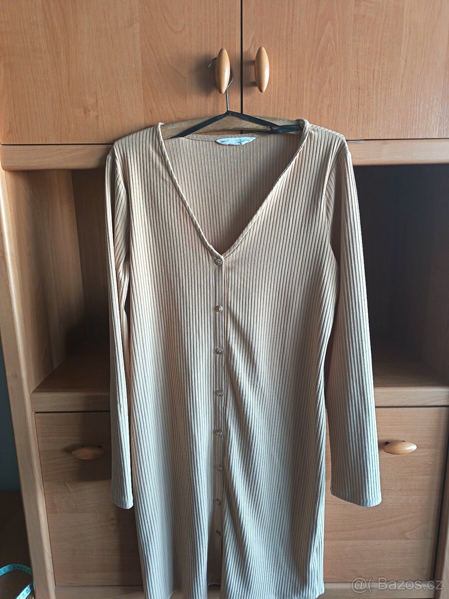 Prodám dámské šaty béžové, pružné, dlouhý rukáv vel. L. Vepředu 8 falešných knoflíků. Délka šatů 96 cm, šířka 47 cm jedna strana. 100% stav. Osobní odběr Praha Stodůlky, zašlu přes zásilkovnu nebo balikovnu.