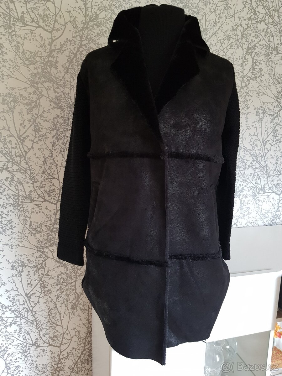Kabátek černý kombinovaný úplet, kožíšek a semiš na patenty vel