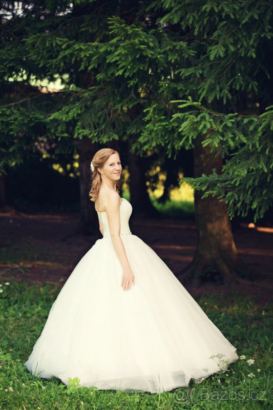 Nabízím luxusní svatební šaty + závoj ve stylu císařovna Sissi, dovezené z Anglie, jako nové, použity pouze jednou :). Velikost uvedena XS, já nosím 36, košíčky 70C, hodí se pro 32-40, prsa snese menší i větší. Já výška 167 cm, pro výrazně menší bych nedoporučila, spíš vyšší. Zapínání vzadu na zip a šněrování. Materiál 100% polyester, vrchní sukně tylové. Vršek je zpevněný, nepotřebovala jsem ani podprsenku, všechno pevně drželo :). Zdobené našitými kamínky, perličkami.. Sukně má celkem 9 vrstev. Bez spodniček (dají se půjčit). Závoj je našitý na průsvitném hřebínku, "přehazovací". Šaty 10.300,- Kč, závoj 700,- Kč, možno zvlášť.