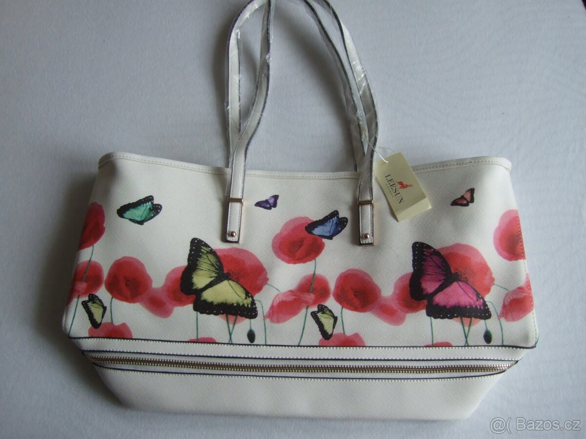 Kabelka s motýlky. Nová, nepoužívaná. Výška 28 cm, šířka 51 cm a dno 15 x 37 cm. Dá se nosit přes rameno.
