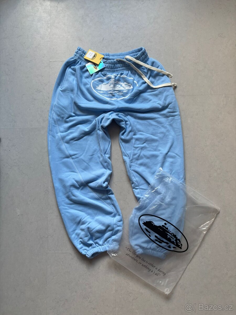 Prodám nové Corteiz, světle modré tepláky velikosti L. Délka je 105cm a v pase mají 38cm. Jsou 100% bavlněné