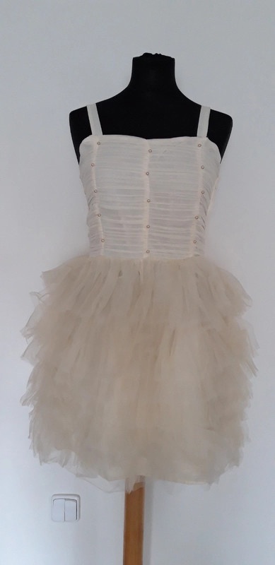 Krémové šaty v dobrém stavu, vel. XS/S, na kterých jsou na předním díle našité korálky. Obvod hrudníku 84cm, obvod pasu 70cm delka od ramen 83cm, v boku je zip