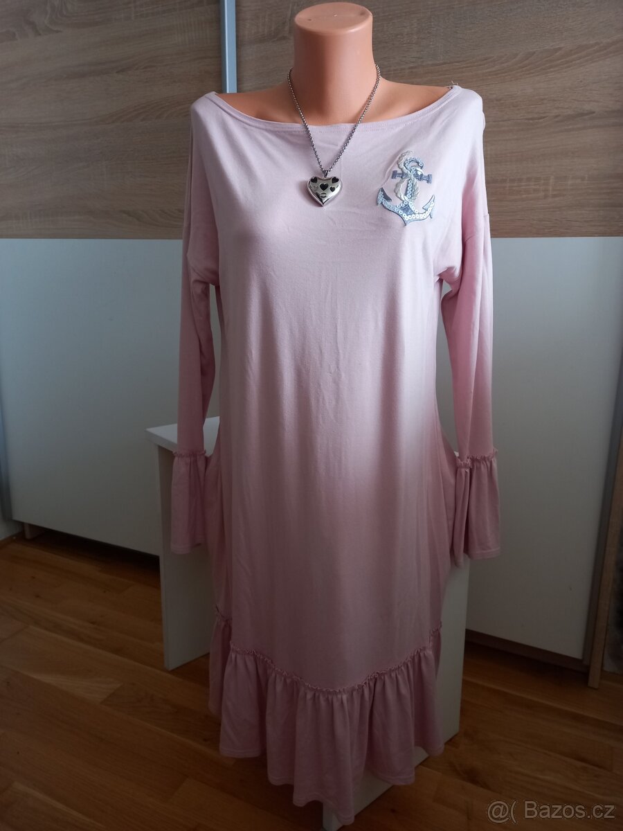 Prodám dámské šaty zn. First, vel. L/40. Starorůžová barva, široký výstřih na ramena, šíře 52 cm, délka 92 cm, délka rukávů - měřeno od krku 68 cm, materiál 92% bavlna, 8% elasten. Nové. Cena 120,- + poštovné. Odesílám přes zásilkovnu nebo poštu.
