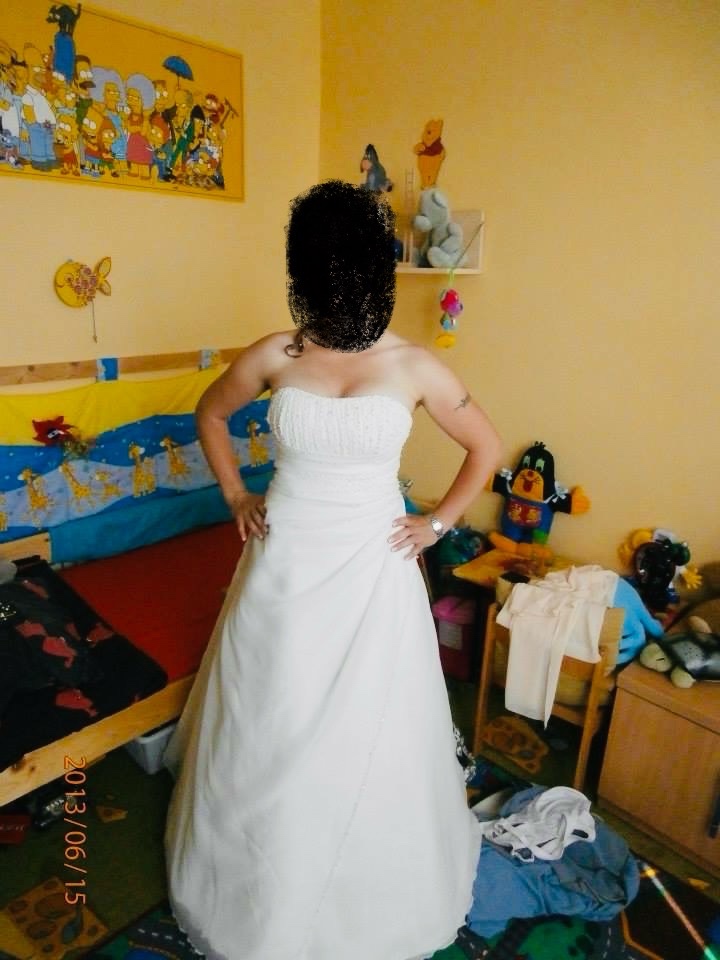 Prodám krásné svatební šaty smetanové barvy, šaty odpovídají velikosti M/L - 40/42. Šaty jsou profesionálně zkrácené na postavu vysokou 163 cm + podpatky. K šatům v případě zájmu zdarma přidám šifonový přehoz přes ramena a doplňky do vlasů. Vážným zájemcům šaty přeměřím, podrobněji nafotím apod.