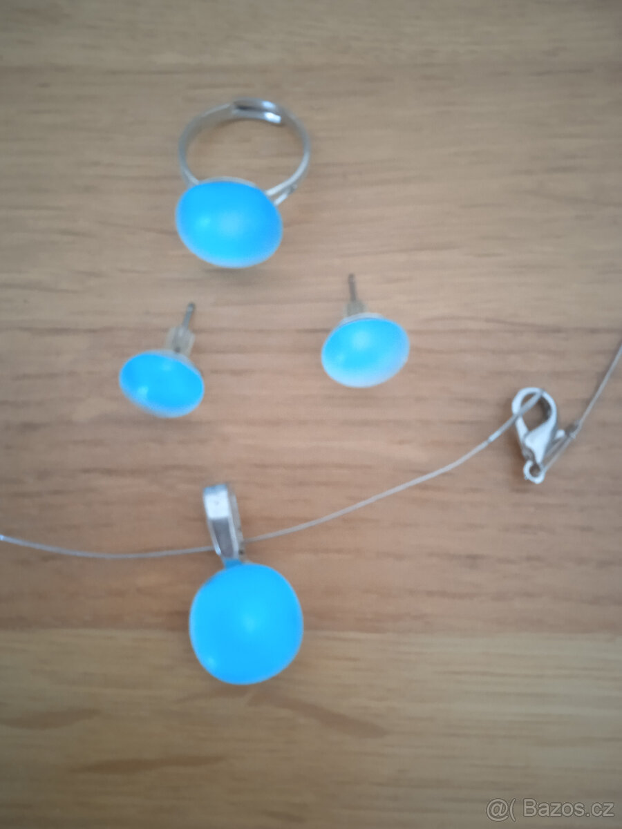 Prodám set šperků svítivě tyrkysové barvy. Přívěsek 1,5 cm na lanku, naušnice průměr 1 cm, prsten nastavitelný.