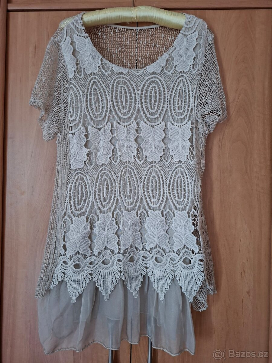 Krajková halenka, vel 42, obvod prsa 100, délka 82 cm, složení - 57% polyester, 40% viskóza, 3% elastan. Nová, nenošená.