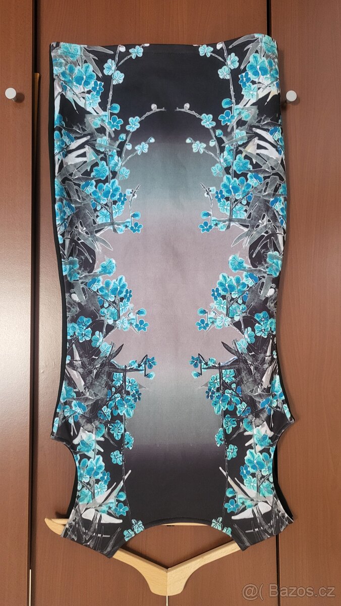 Vel 40-délka 86, prsa v klidu 2x46cm- elastická látka, pas v klidu 2x40cm, boky v klidu 2x47cm. Nošené.