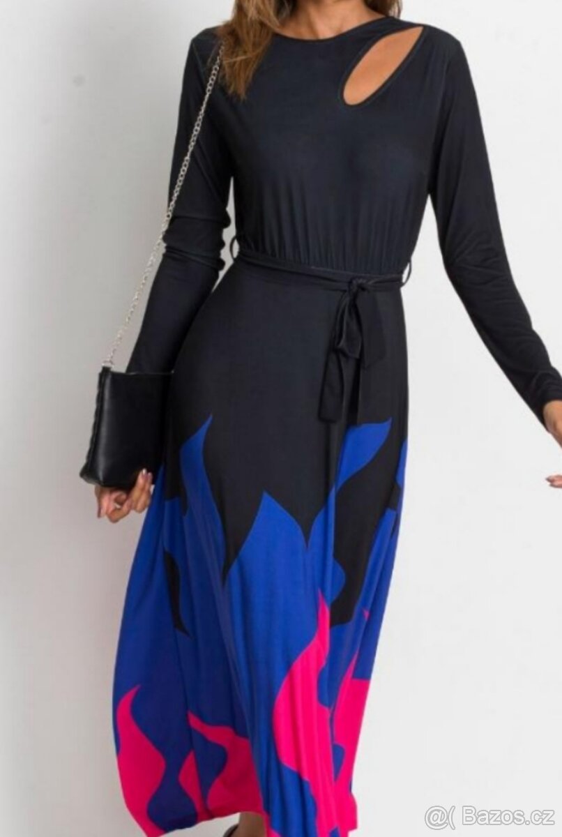 Kombinace tří barev, průstřih na předním díle. Nové. Materiál s elastanem. Šaty nejsou průhledné. Uvedená vel.32/34 řiďte se rozměry.